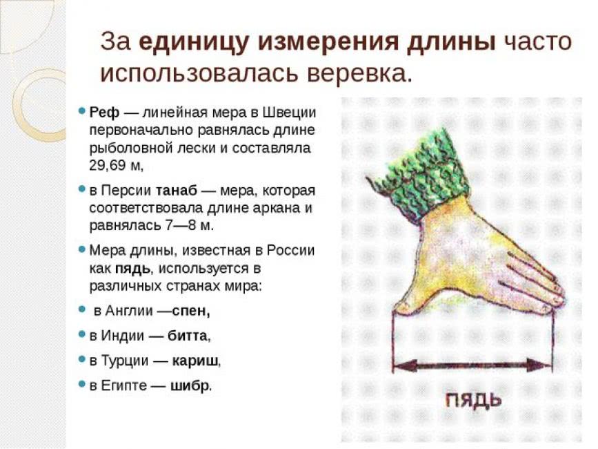 Когда нужно было измерить что-то меньше, чем аршин, применяли другую единицу измерения — пядь. Она появилась от аршина и составляла ¼ от него. Расстояние между расставленными указательным и большим пальцами-это и была пядь. Пядь примерно 18 см.