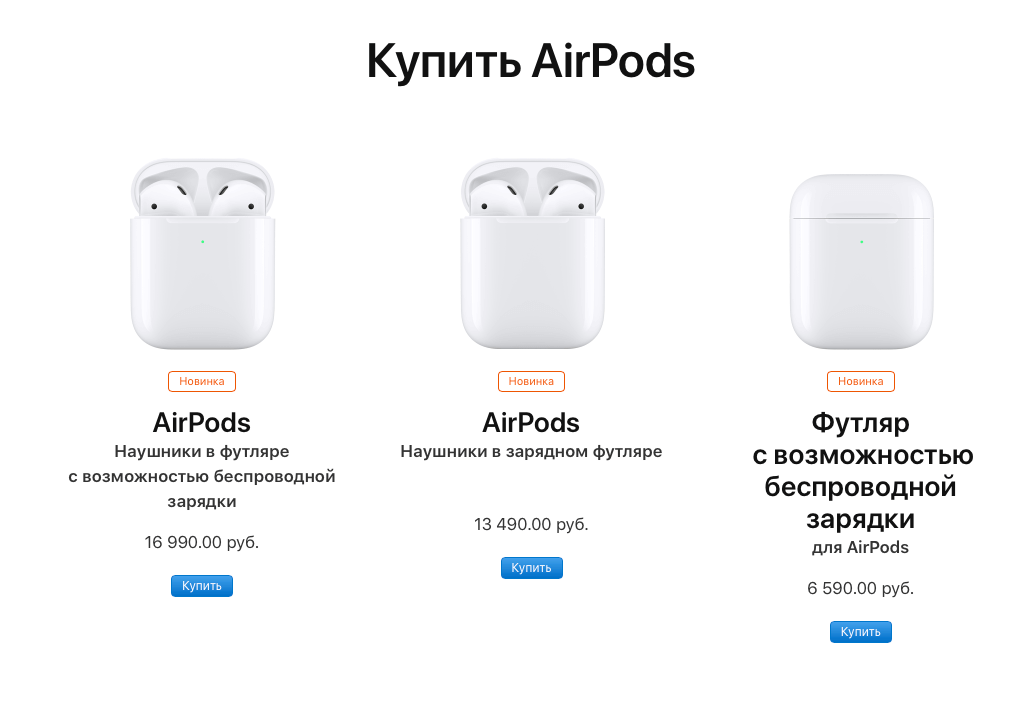 На данный момент у вас есть возможность купить AirPods 2 с поддержкой беспроводной зарядки за 16 990 рублей, AirPods 2 с простым кейсом за 13 490 рублей и кейс с Qi за 6590 рублей, его можно использовать с наушниками первого поколения. Наушники второго поколения стоят столько же, сколько и первые AirPods, визуально их очень сложно отличить. Подозреваю, будет ещё путаница из-за нежелания Apple хотя бы сделать двойку на коробке (коробка вторых AirPods ничем не отличается от первой — только год другой, 2018).