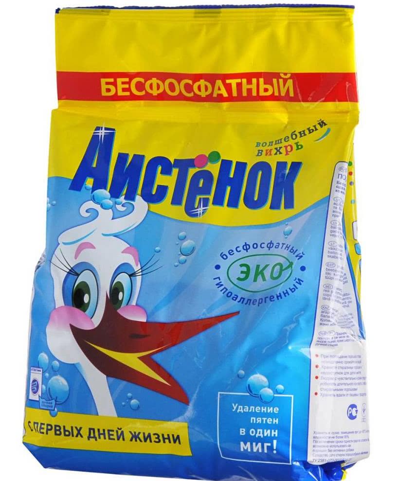 Аистенок предназначен для машинной стирки – при ручной он плохо растворяется в воде и практически не отстирывает пятна.