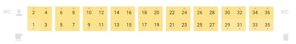 Подобным недостатком обладают и полки под номером «36» и «35». Главная их особенность в том, что располагаются они поблизости с туалетом, а поэтому отгорожены специальной перегородкой, которая ограничивает длину.