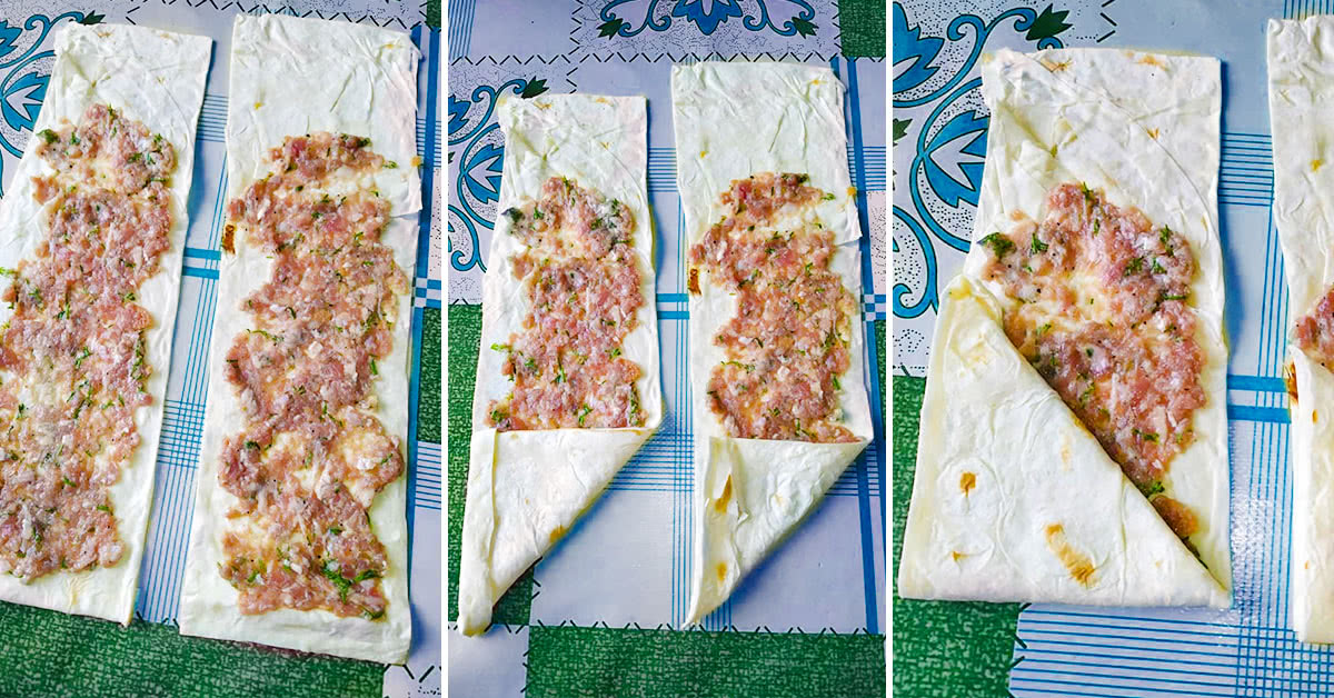 Выложить на половину блина мясную начинку на один угол, как показано на фото.