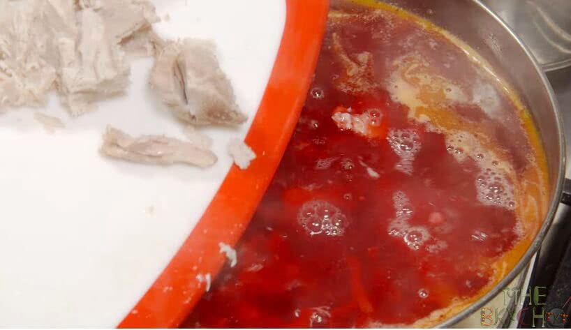 15.Кусочки мяса добавляем в борщ. Солим, перчим и кладем лавровый лист. Варим еще буквально одну минуточку и снимаем с огня.