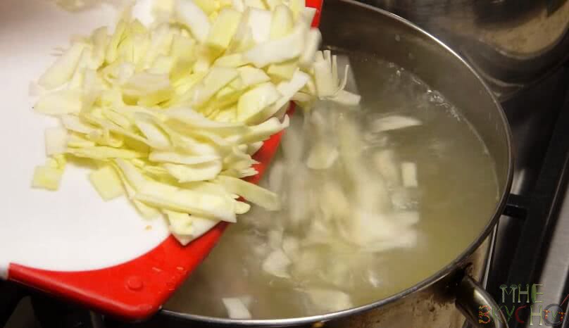 Треть вилка свежей капусты тонко шинкуем, отправляем в кастрюлю спустя 10 минут после картофеля.