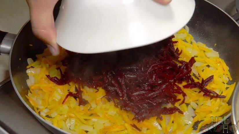 Если она сильно кислая можно промыть ее в под водой. Это на ваше усмотрение, кто-то любит борщ чтобы был сильно кислым, другие наоборот. - Сырую свеклу и морковь трем на терке, а репчатый лук измельчаем кубиком. Спассируем на сковороде с постным маслом подготовленные овощи. Сначала выложим репчатый лук и обжарим его минуты 2-3. Далее — отправим пассировать морковь 3-5 минут. В конце — добавляем свеклу, обжариваем овощи вместе еще 5 минут.