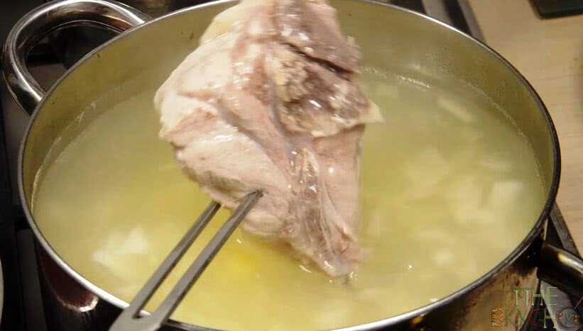 Потом убираем кости, жидкость процеживаем, закладываем свинину куском, варим из мякоти мясокостный бульон не менее двух часов.