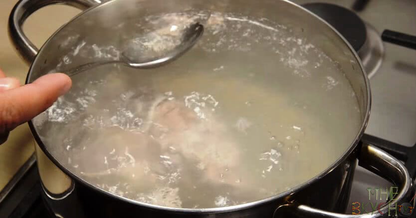2. Перед самым закипанием появится пенка. Ее нужно снимать ложкой с дырочками. Такие ложки очень удобные — пенка остается, а сам бульон сливается обратно в кастрюлю.