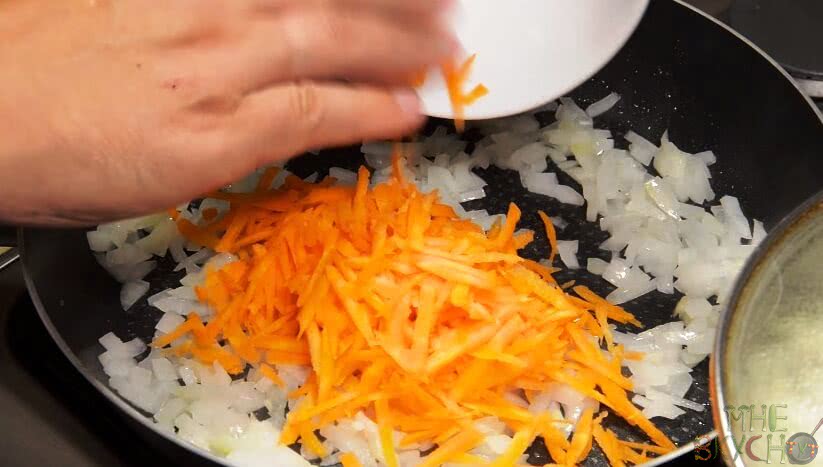 10.К луку присоединяем натертую морковку. Немного ужариваем.