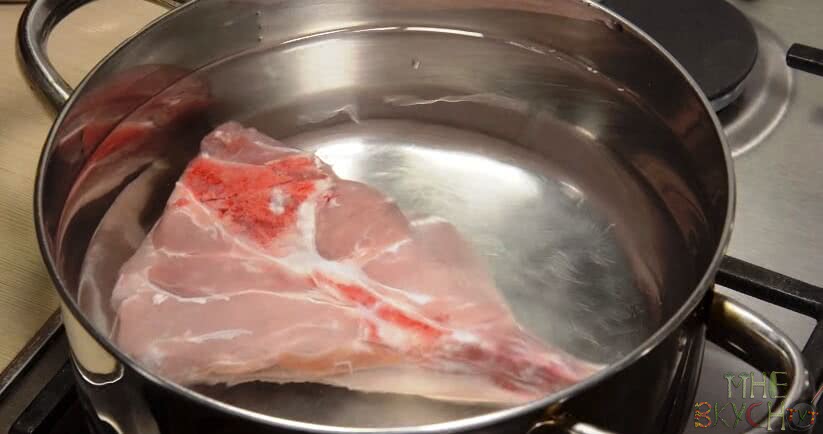 - Свинину промываем водой, помещаем в варочную кастрюлю и заливаем холодной водой. После закипания снимаем пену и варим бульон до готовности мяса (если оно на кости — не менее 1,5 часов).