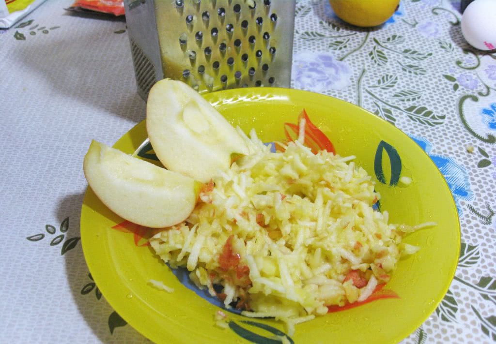 - Измельчите яблоки на терке, блендером, пропустив через мясорубку или корморезку. Объем фруктовой массы – 1 л.