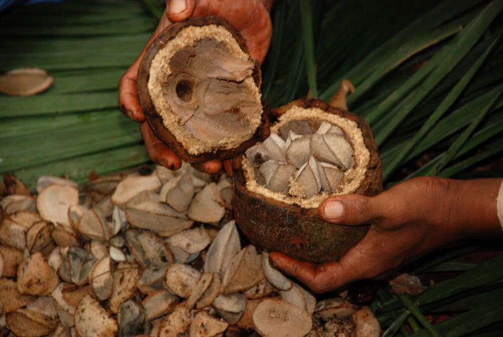 Спеет орех довольно долго — до 12 месяцев. В одном орехе можно собрать около 2 кг зёрен. В год одно дерево даёт до двухсот килограмм зёрен. Очищенные орешки обладают приятным нежным запахом и вкусом. Внутри каждого зёрнышка находится мягкая вкусная масса, по форме напоминающая кашу.