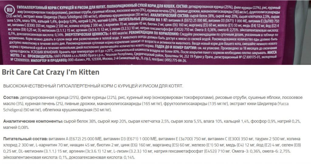 Изучим состав сухого корма Brit Care Cat на примере варианта Crazy I’m Kitten (для котят). Для начала кликните по изображении ниже, чтобы увеличить его для удобности чтения: