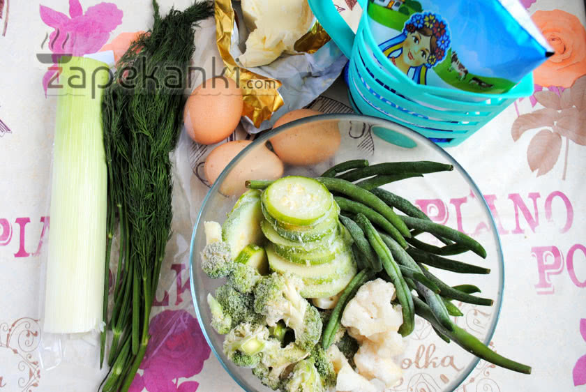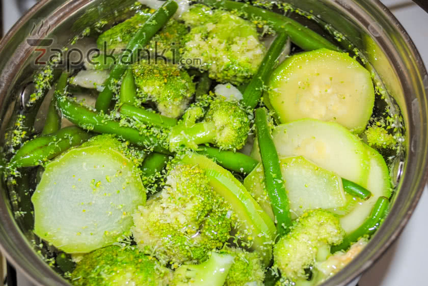 1. Поставить кастрюлю с водой на огонь, посолить и ждать пока закипит. В кипящую воду выложить цветную капусту, брокколи, стручковую фасоль и кабачок. Варить овощи после повторного закипания 3-5 минут. На самом деле к цветной капусте с брокколи подойдёт любой набор овощей. Вы можете использовать болгарский перец, помидоры, морковь, цукини, шпинат и всё, что найдёте в холодильнике. Я решила использовать для этой запеканки зелёные овощи замороженные с лета.
