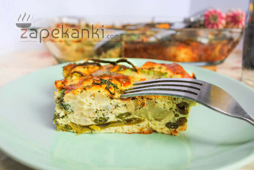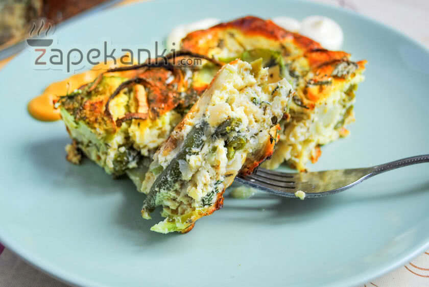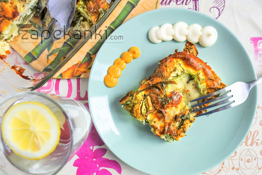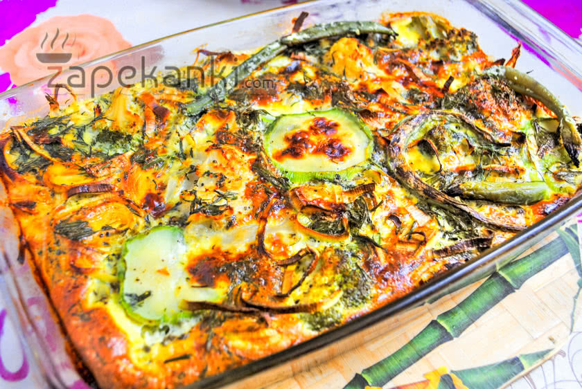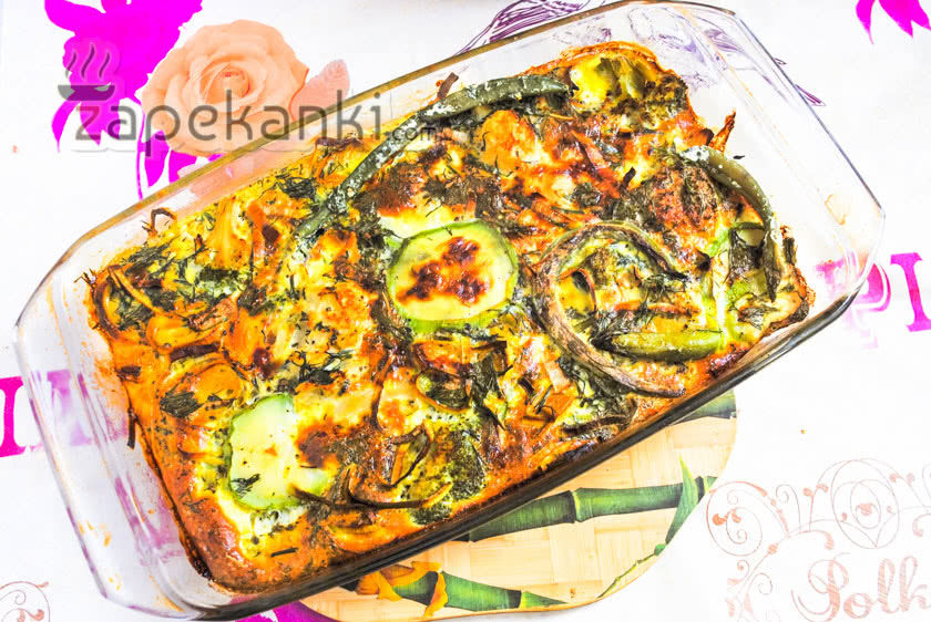- Духовку разогреваем до температуры 180 градусов. Форму с запеканкой ставим на средний уровень. Запекаем в течение двадцати-двадцати пяти минут. Яичная заливка за это время полностью затвердеет, овощи дойдут до полной готовности, а поверхность заметно зарумянится. Достаем готовую запеканку из духовки и подаем к столу в горячем виде. Поверхность можно посыпать свежей рубленной зеленью для аромата. Разрезаем запеканку на порционные куски прямо в форме.