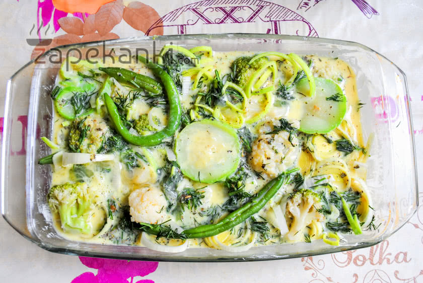 - В форму для выпекания выложите брокколи, цветную капусту, лук и перец. Залейте приготовленной смесью.