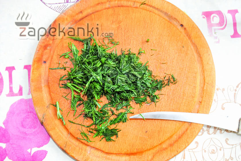8. Выложить отваренные овощи в форму. Поверх распределить лук-порей и укроп.