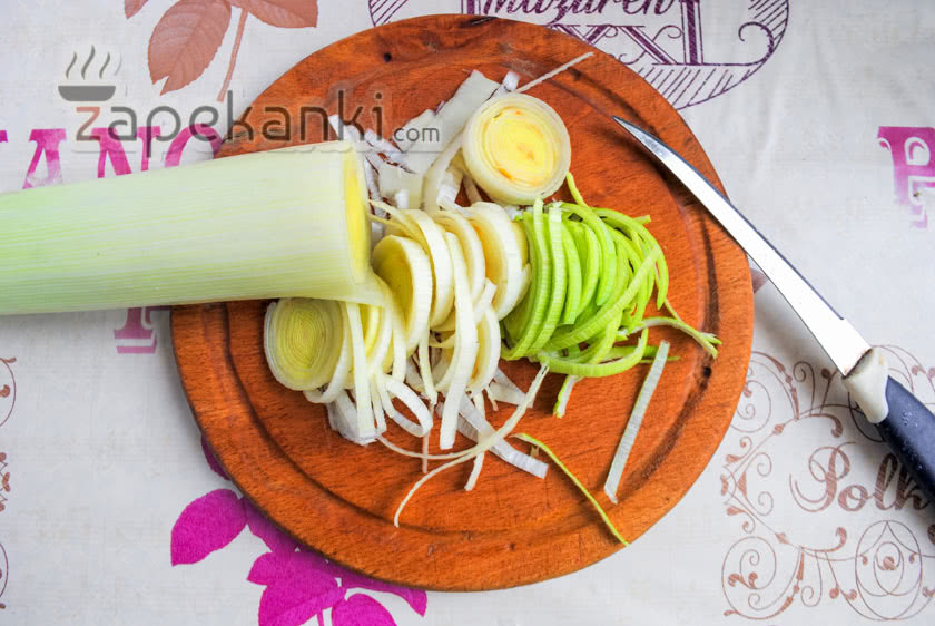 2. Пока овощи варятся помыть и нарезать тонкими колечками лук-порей. Вообще можно взять любой другой лук: репчатый, лук-шалот. Порей мне нравится своим ароматом.