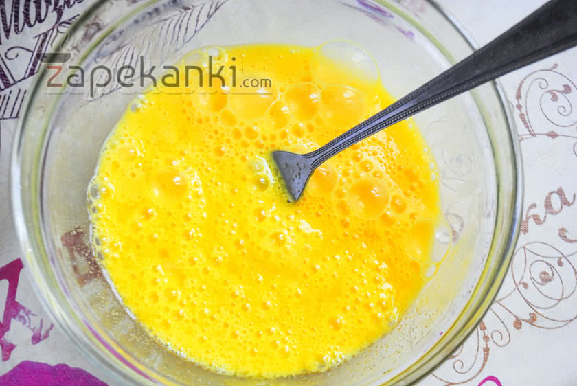 4. Яйца размешать вилкой. Если есть время и желание, то белки можно взбить отдельно от желтков, тогда омлет получится более воздушным.