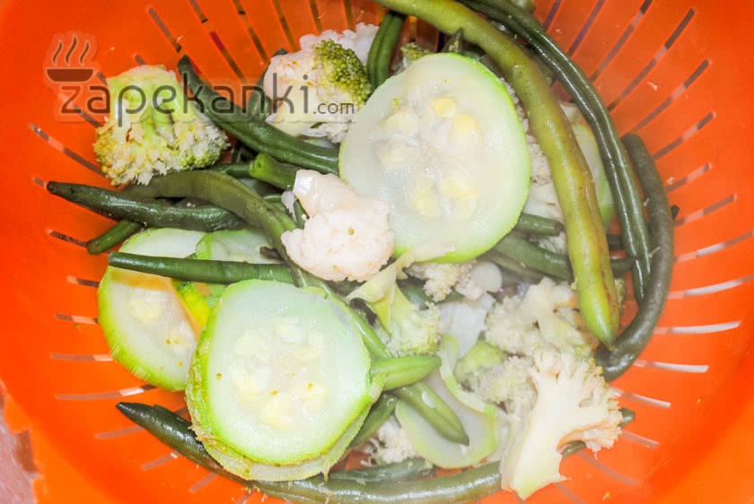 6. Тем временем, сваренные овощи откинуть на дуршлаг.