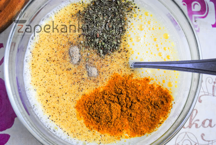 5. Добавить к яйцам молоко и специи: прованские травы, карри острый, чесночный перец и соль. Вы можете использовать ваш любимый набор специй. Вместо молока также подойдёт кефир, несладкий йогурт или сметана. Перемешать яичную массу.