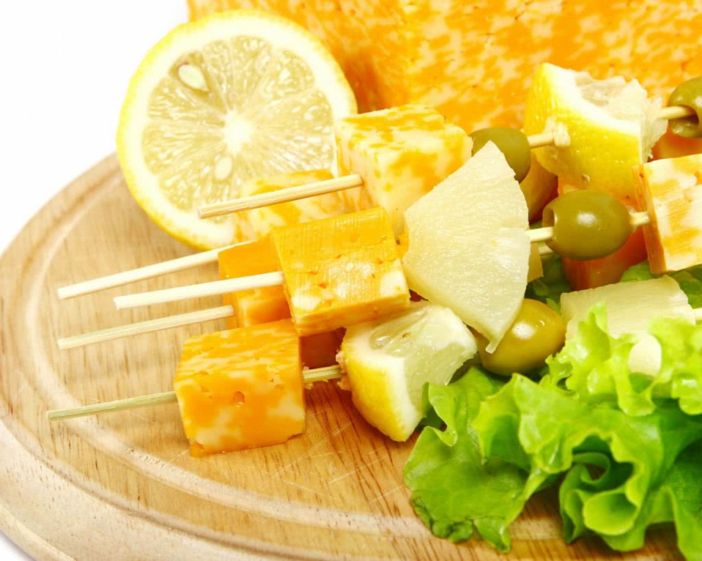 Лимон с пластинками сыра. Это вариант закуски можно приготовить как в форме канапе, так и свернув две пластинки конвертиком.