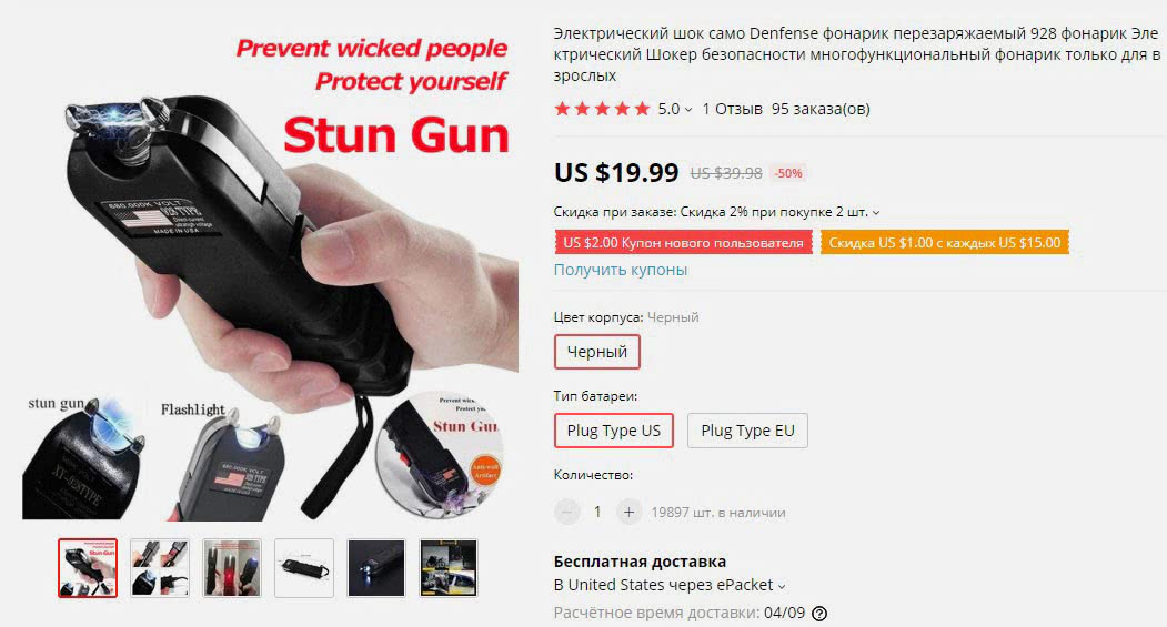 Пример из практики: мужчина заказал на Aliexpress фонарик-электрошокер, чтобы защищаться от собак. Посылка не пришла, зато пришел штраф на 2 тыс. рублей.