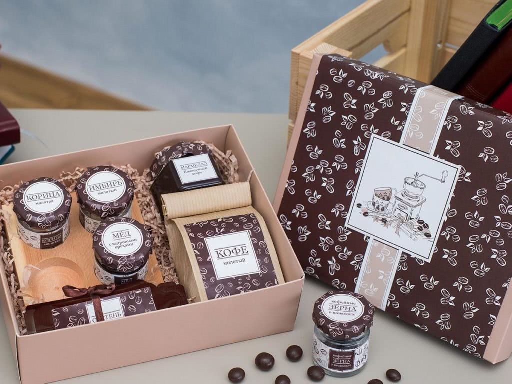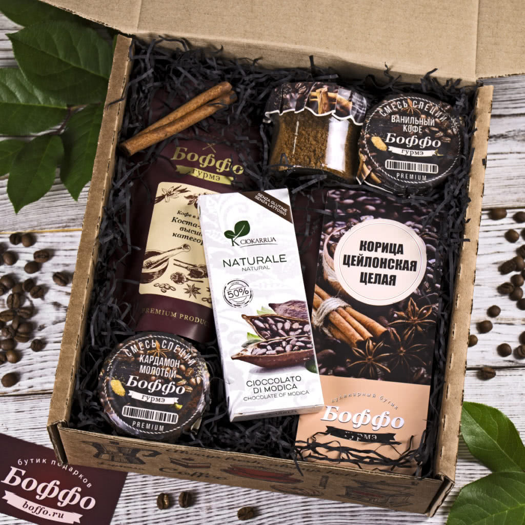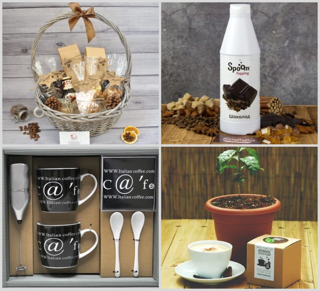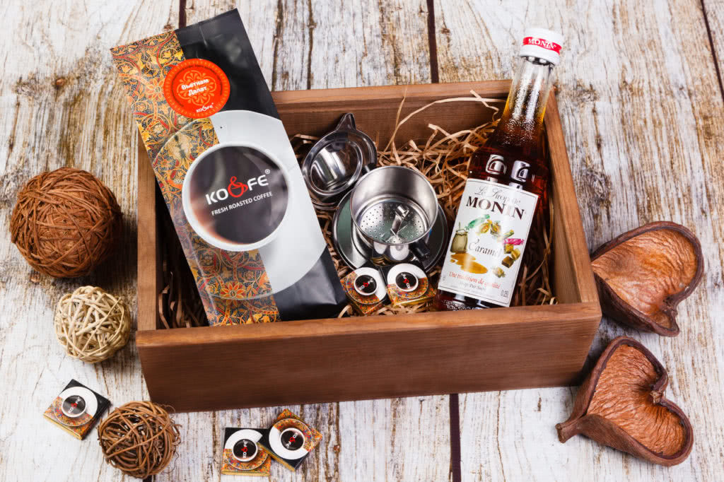 - подарочная корзина с несколькими видами зерен, сиропами, специями, сладостями;