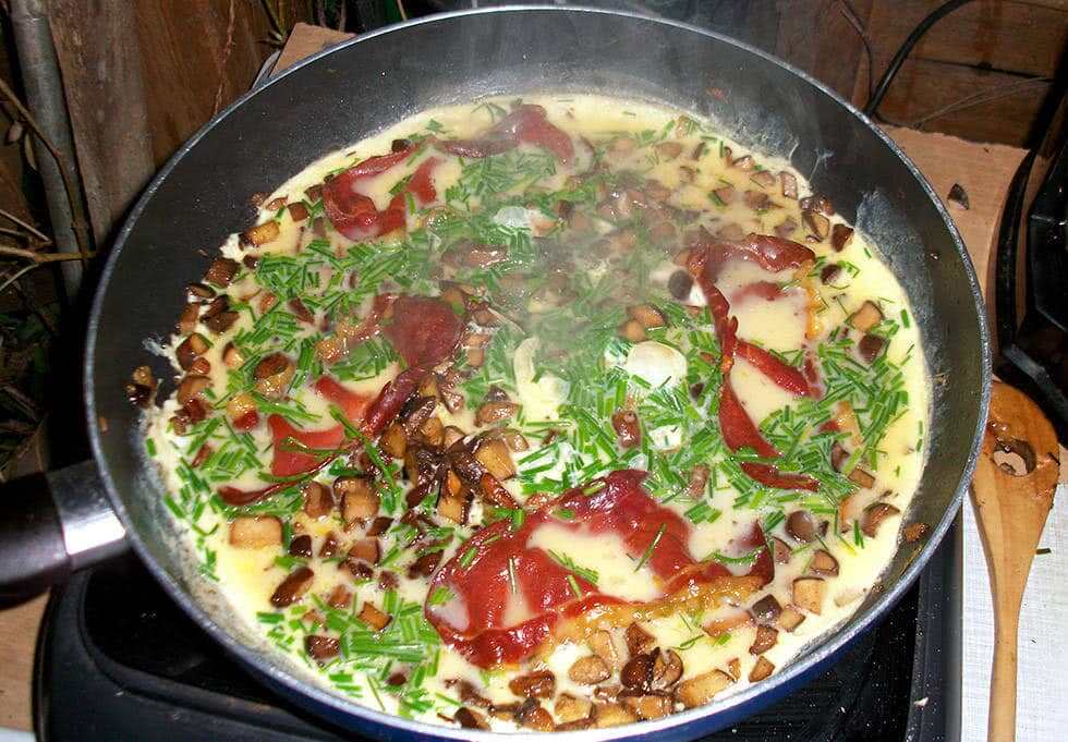 - В отдельной емкости сбиваем яйца с небольшим количеством воды и заправляем все специями. Вливаем полученную смесь на сковороду и томим на медленно огне 3 минуты.