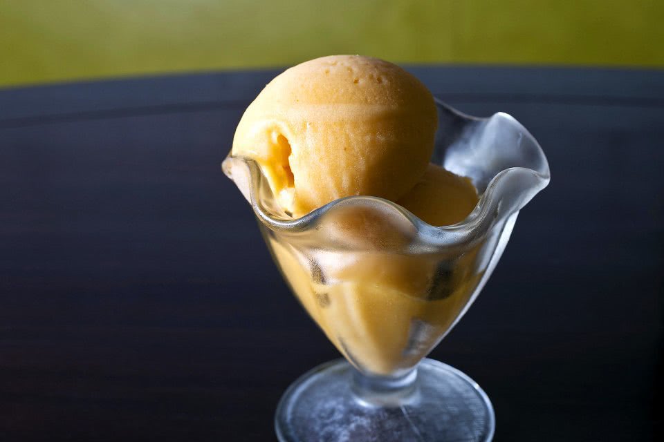 Это тоже сезонное мороженое, мы делаем его с мая по сентябрь. Сорбет делаем из пюре абрикоса и сахарного сиропа и закладываем во фризер».