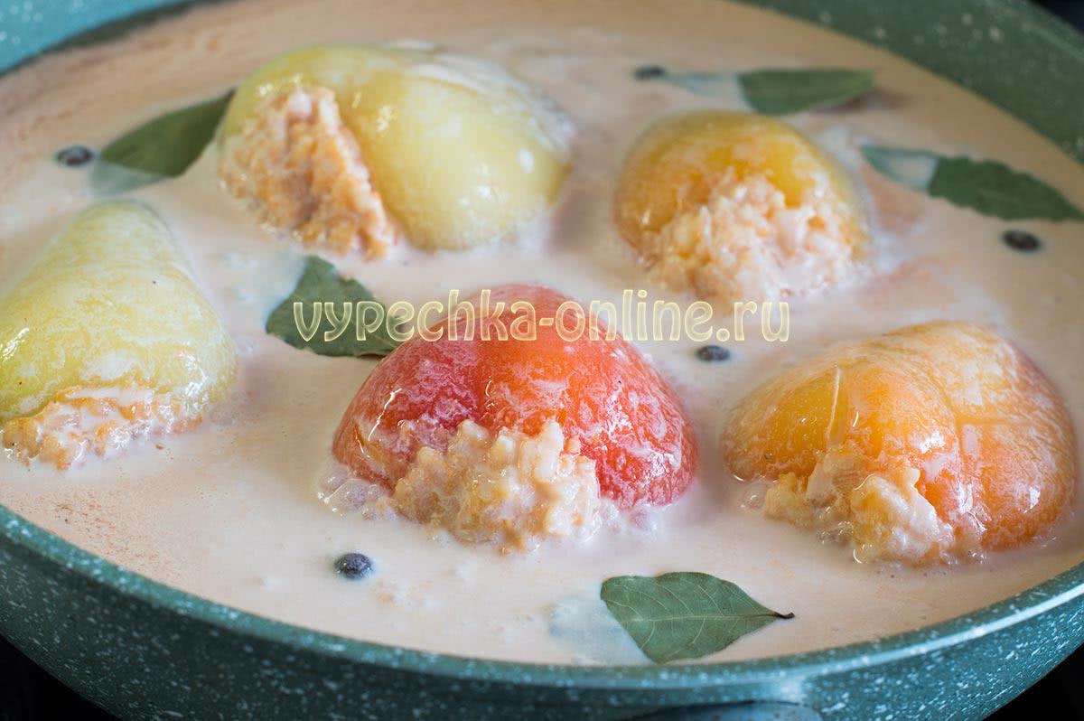 Фаршированные перцы мясом и рисом запеченные в духовке под сметанным соусом