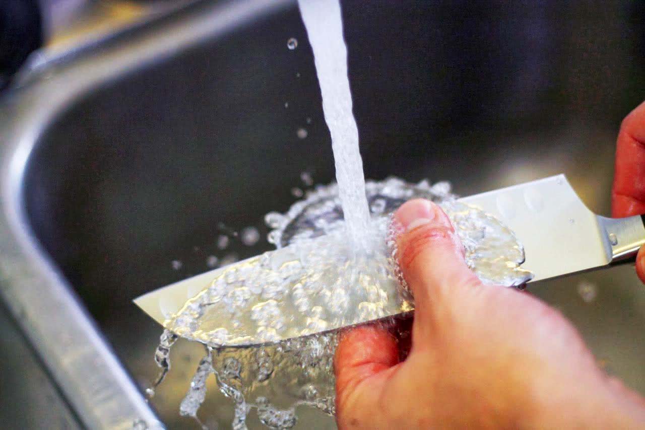 Столовые приборы можно замочить в растворе из средства для мытья посуды Fairy. Для этого в воде разводят 5 капель геля и погружают в него предметы на 30-40 минут. Загрязненные поверхности дополнительно трут мочалкой или щеткой. Затем посуду ополаскивают.