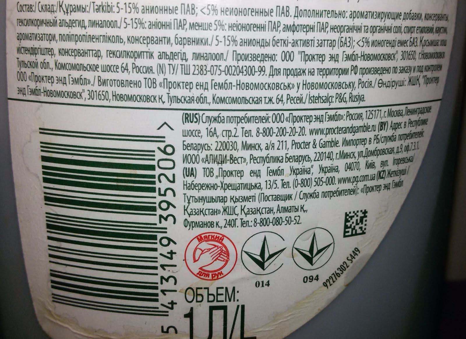 Поэтому в составе Фэйри, а также во всех моющих средствах, присутствуют анионные и неионогенные вещества в количестве, не превышающем нормы ГОСТа.