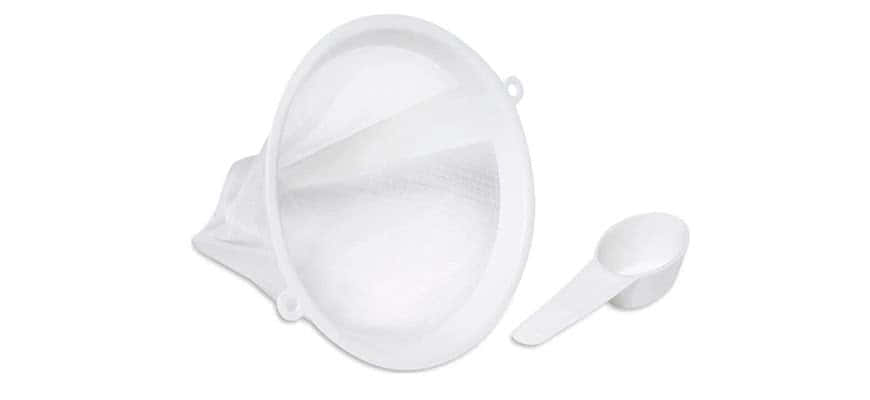 Вам потребуется вырезать круг из капронового чулка. Его размер должен быть немного больше, чем у воронки. Такой фильтр можно при необходимости использовать повторно.