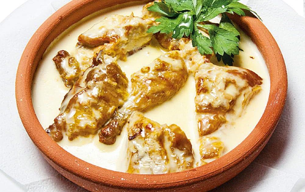 Сациви – мягкая домашняя курица под соусом баже из грецких орехов, но с другими специями и пряностями.