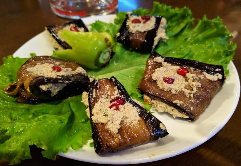 Блюда грузинской кухни из баклажанов называются бадриджани. Первым делом советуем попробовать традиционную холодную закуску в виде рулетов. Это нигвзиани бадриджани из грецких орехов, перемолотых с чесноком и имеретинским шафраном. Массу выкладывают на полоски печеных баклажанов и сворачивают рулетиками.