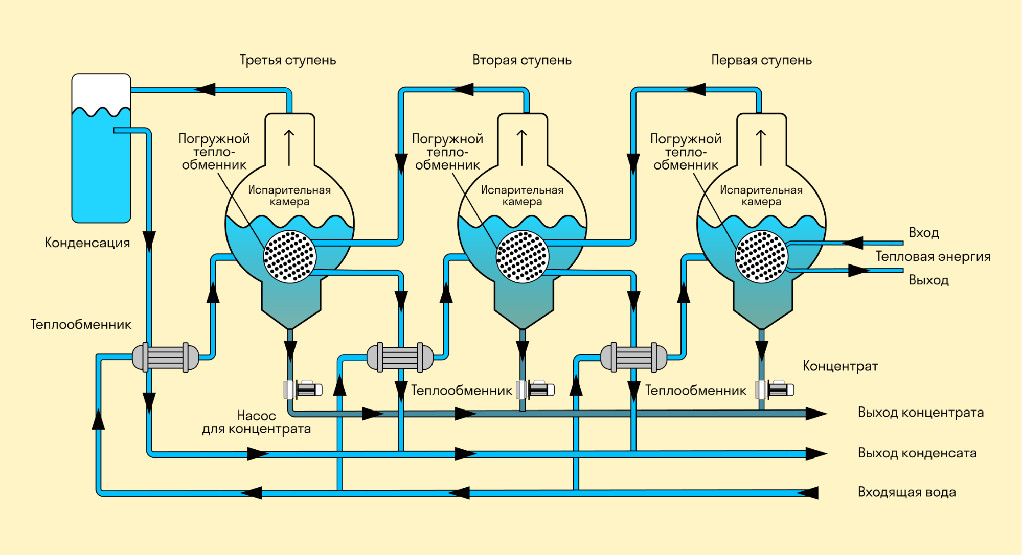 Например, испаритель, изображенный на схеме, состоит из совокупности соединенных между собой испарителей. В основе его действия — пар, полученный в одной ступени, который используют в качестве источника тепла для следующей ступени. По мере того, как температура уменьшается от одной ступени к другой, вакуум увеличивается, так что температура кипения становится ниже и испарение поддерживается. Он предназначен для того, чтобы очистить воду от отходов.
