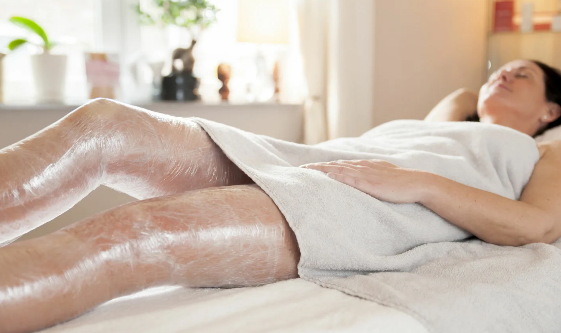 - Нанесение состава. Намажьте охлаждающие или разогревающие смеси на выбранные участки кожи, и обмотайте их пищевой пленкой. После укутайтесь в теплое одеяло.