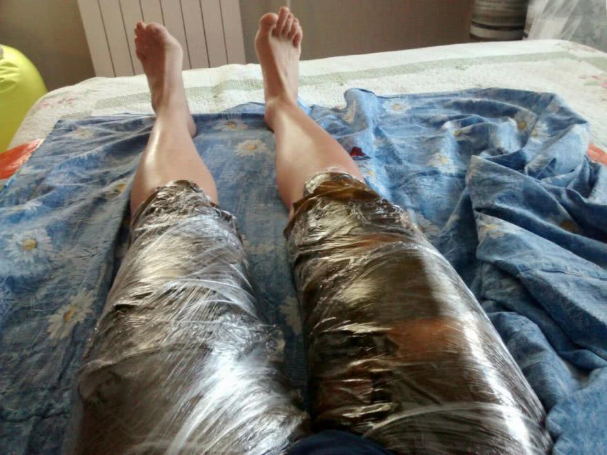 - Аккуратно обмотай ноги пищевой пленкой и оставь для воздействия на 15-25 минут;