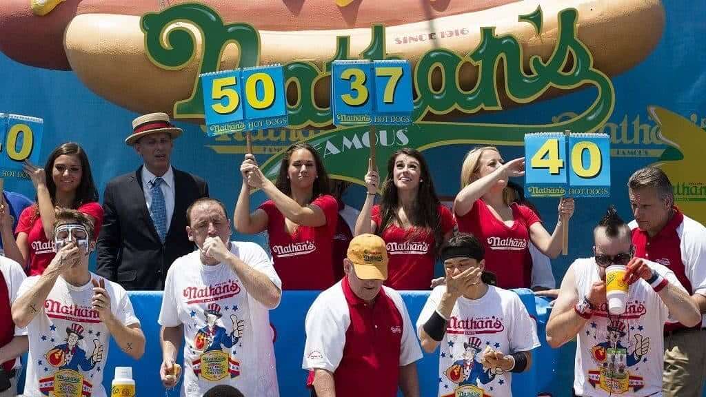 В Нью-Йорке именно 4 июля каждый год проводится чемпионат по поеданию хот-догов. Учредителем выступает компания «Nathan’s Famous», впервые он проводился в 1972 г. 04.07.2018 победил известный многим участник по имени Джоуи Честнат «Челюсти», он установил рекорд в категории в 74 шт. Победа стала 11 по счёту, результат 2017 года — за 10 минут удалось съесть 72 бутерброда. Каждый раз мужчина применяет свою действенную тактику – поглощает по 2 штуки сразу.