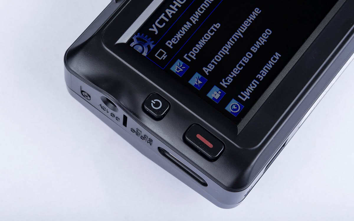 Слева от экрана – две клавиши. Верхняя – включение/выключение, нижняя – старт/остановка записи, защита текущего видеофайла от перезаписи. Кнопки крупные, ход четкий.