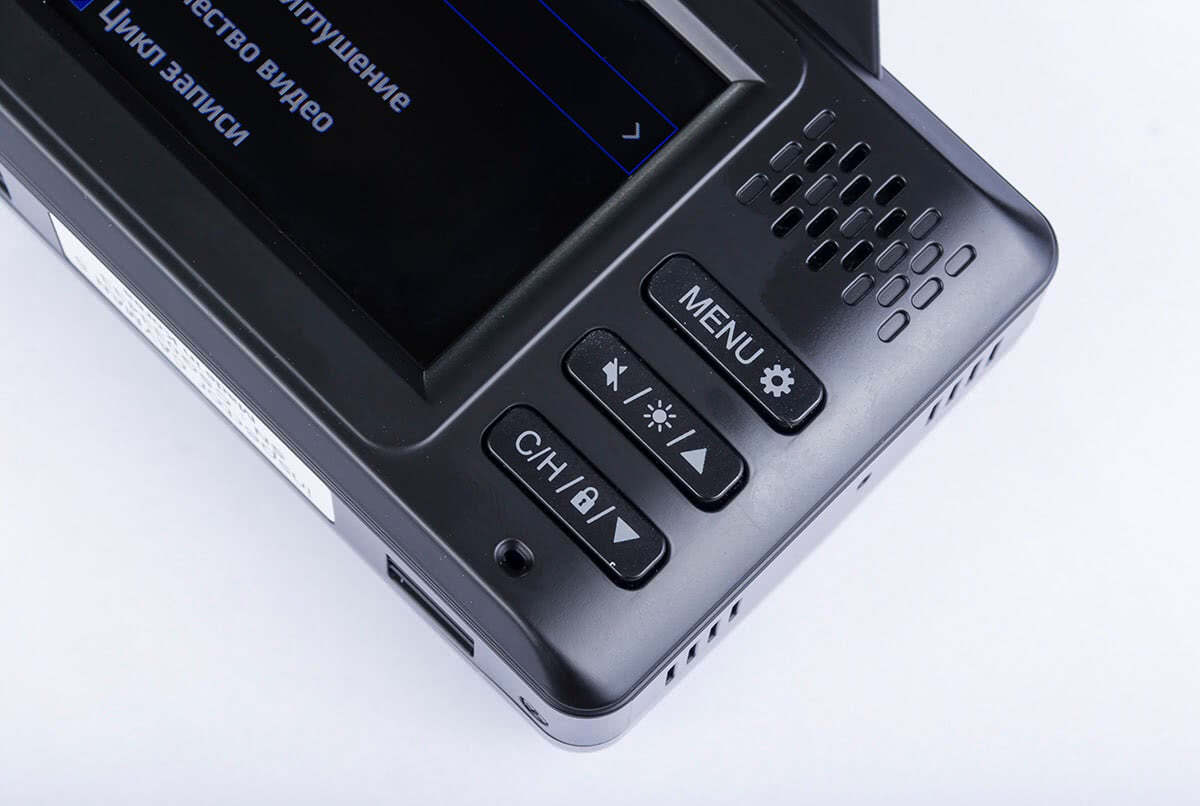Справа – динамик и удлиненные управляющие клавиши, у каждой несколько функций в зависимости от «долгости» нажатия (в частности, вызов настроек, изменение режимов работы радар-детектора, включение/выключение микрофона, экрана, регулировка громкости и яркости). Похвальный подход – чаще производители обозначают в лучшем случае одну из нескольких функций.