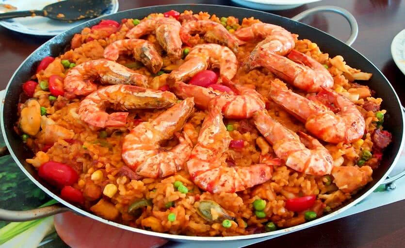 Паэлья – популярное кушанье из Валенсии. В его состав входит рис, овощи, морепродукты, специи. Готовится на больших сковородах.