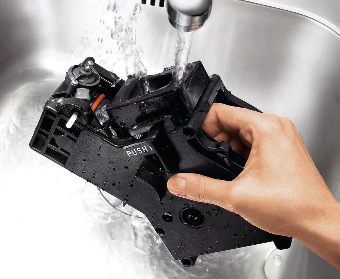 Чтобы очистить капучинатор в кофемашине «Делонги», требуется отсоединить от гайки и снять его с трубки подачи воды или пара. Шарнирную часть нужно разобрать, трубку и шпильку снять. Компоненты промыть под проточной воды, собрать в обратной последовательности, установить на место и подключить трубку.