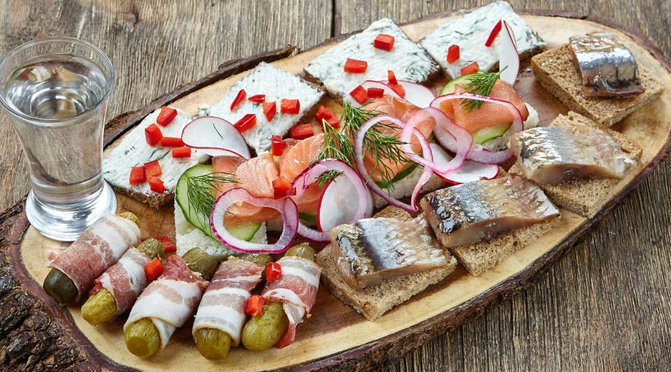 С водкой хорошо сочетается большинство соленых, пикантных и умеренно жирных блюд, поэтому выбор закусок может быть очень обширным. Однако определенные традиции здесь всё же есть, поэтому стоит последовать нашим рекомендациям и не закусывать водку всем подряд, если хотите получить от ее распития удовольствие, а наутро потом — хорошее самочувствие.
