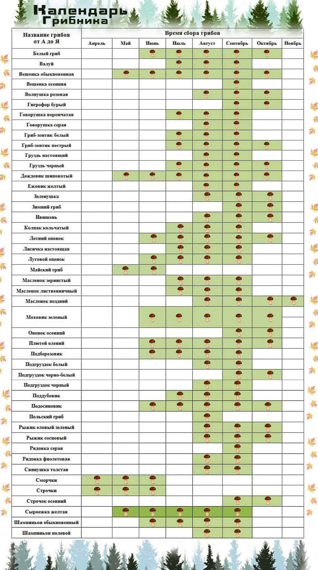 Календарь вам подскажет, когда происходит сбор грибов по видам, и где их можно найти. Это прекрасный помощник для тех, кто только собирается стать заядлым грибником, но пока не знает, с чего начать.