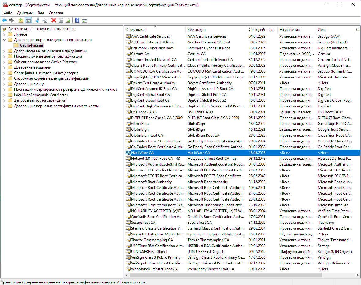 Если вы задаётесь вопросом, в какой папке хранятся сертификаты в Windows, то правильный ответ в том, что в Windows сертификаты хранятся в реестре. Причём они записаны в виде бессмысленных бинарных данных. Чуть ниже будут перечислены ветки реестра, где размещены сертификаты, а пока давайте познакомимся с программой для просмотра и управления сертификатами в Windows.