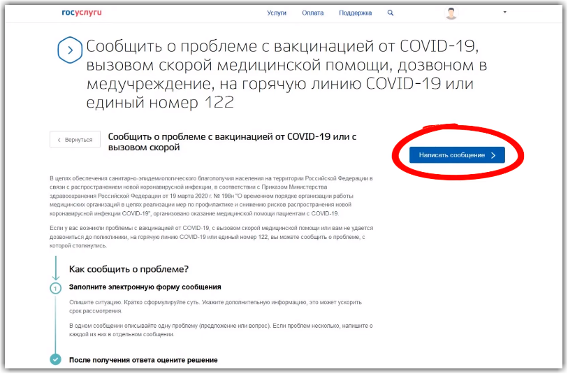 Открывается страница, где нужно выбрать «Написать сообщение». Заполняем предложенную форму и отправляем ее. В течение положенного срока вам придет ответ с подробными инструкциями.