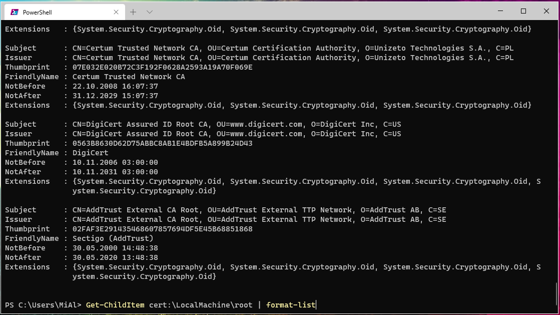Get-ChildItem cert:\LocalMachine\root | format-list