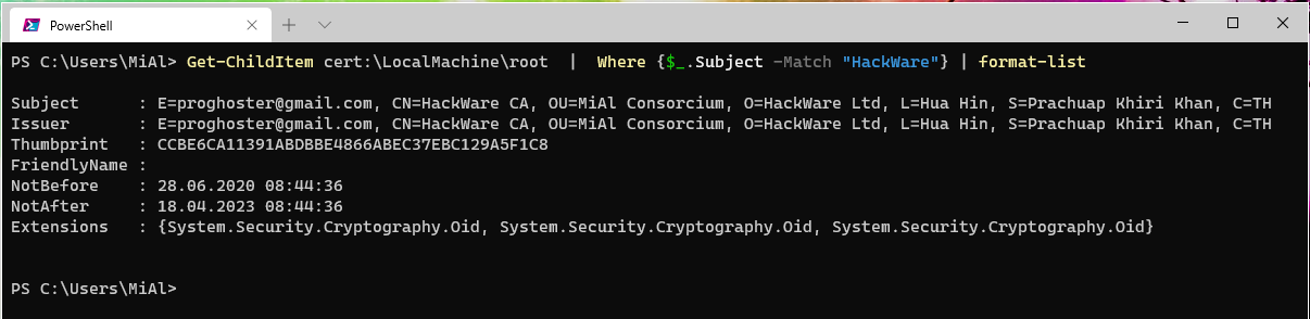 Get-ChildItem cert:\LocalMachine\root | Where {$_.Subject -Match "HackWare"} | format-list
