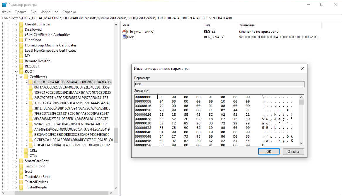 - HKEY_LOCAL_MACHINE\Software\Microsoft\SystemCertificates — содержит настройки для всех пользователей компьютера
