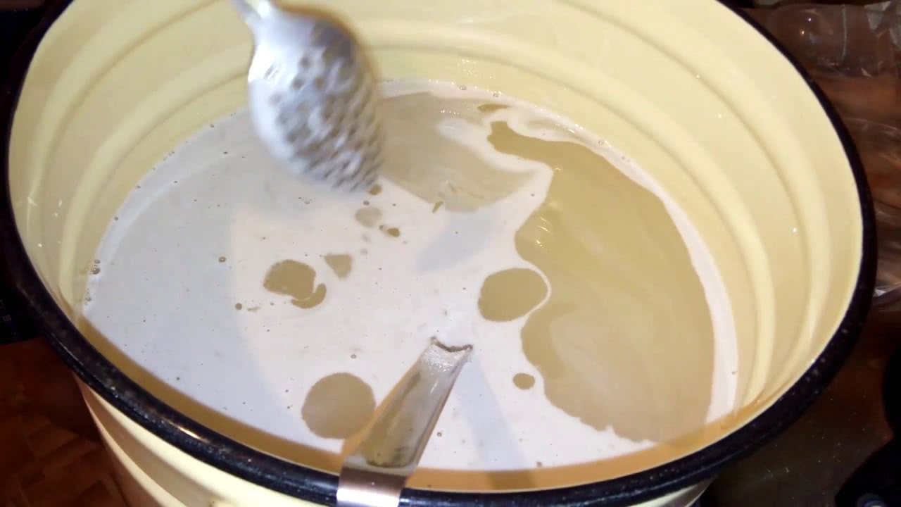- На второй день брожения на разброде появляется пенка и выделяется углекислый газ. Присутствует характерный кисло-сладкий запах. На 4-5 день количество пены уменьшится, а пузырьков станет больше.